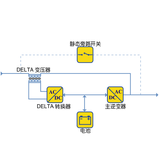 ? UPS設計是一種較新的設計,這種十年前引入的技術,它克服了雙轉換在線式設計的缺點,適用于功率范圍5kVA到1.6MW的應用領域。與雙轉換在線式設計相似,?Delta?轉換在線式UPS始終由逆變器提供負載電壓。然而,附加的Delta轉換器也向逆變器輸出供電。在交流電源出現(xiàn)故障或受到干擾的情況下,這種設計所表現(xiàn)出的行為與雙轉換在線式設計完全相同。